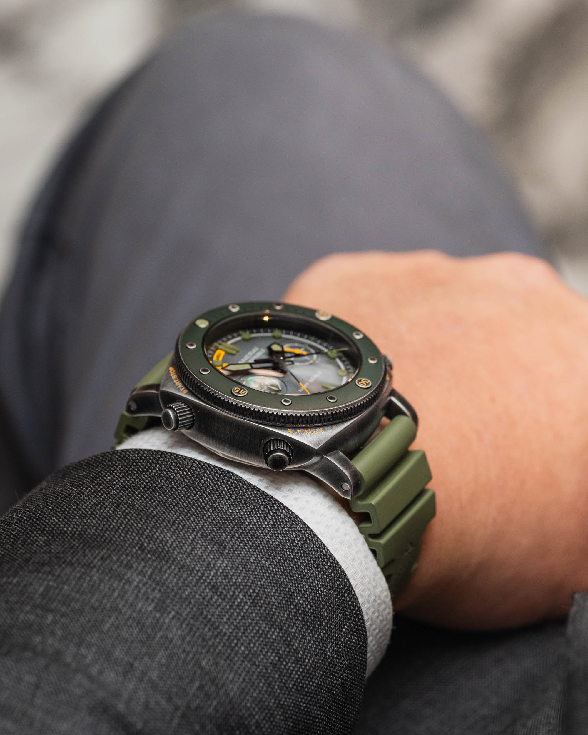 De unidirectionele titanium bezel heeft een matgroene keramische inzet. Het past bij de olijfkleurige rubberen kroon en de Caoutchouc band, wat de militaire esthetiek benadrukt. De rubberen kroon functie was gemakkelijk te gebruiken, maar ik ben er niet van overtuigd dat het het juiste materiaal is om te gebruiken, vooral op een zeer interactief onderdeel van het replica horloge. Dezelfde militaire groene tint is te vinden als het lichtgevende materiaal in de wijzers en drie-dimensionale markers. De kleur biedt voldoende contrast tegen de antracietkleurige wijzerplaat voor leesbaarheid in standaard lichtomstandigheden, maar kan moeilijk af te lezen zijn bij weinig licht als de lume niet voldoende is opgeladen. Gele markeringen geven de flyback chronograaf- en aftelfuncties aan. De gele chronograafwijzer kan worden geactiveerd en op een specifieke positie worden gezet door herhaaldelijk op de aftelknop op 4 uur te drukken. Dit is een zeer specifieke functie die velen niet nodig zullen hebben, maar die handig kan zijn voor specifieke training- of missiegerichte doeleinden voor degenen die onthouden om het te gebruiken.